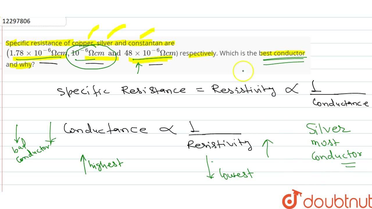 Specific Resistance Of Copper Silver And Constantan Are 1 78 Xx 10 6 Omega Cm 10 6 Omega Cm And 48 Xx 10 6 Omega Cm Respectively Which Is The Best Conductor And Why